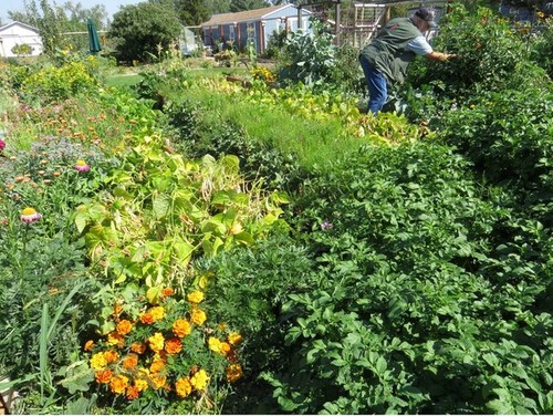 The garden gets way bigger than you think it will. Here's quick-pix of my husband picking peas, and these beds are about 3 feet apart.