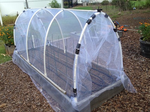 I place a panel on each end of the bed and then a big piece from one side of the bed to the other side. So I just have to undo a couple of clips to raise up the side of the tulle to hand pollinate. I use jumbo binder clips purchased at the office supply store to secure the tulle to the PVC.