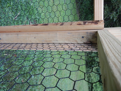 We split the 2x4s on a table saw about 1/3 of the way into the board. I took the 2/3's chunk of the 2x4 and built the actual rectangular frame with center support, put it in place added the fencing and screwed the 1/3 side of the board facing on. Then I had a finished sandwich panel.