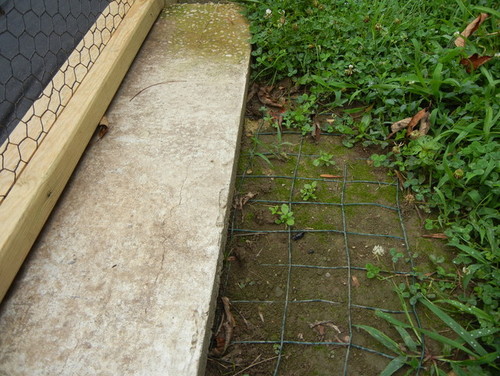 The groundhogs could still dig under if they wanted to so to add a bit of extra protection I took the old garden fence and cut it into thirds. Before we re-laid the sod back down I tucked the old garden fence under the concrete slabs. Our hope is if they start digging, they will hit fence and will not be able to go any further. (insert evil laugh).