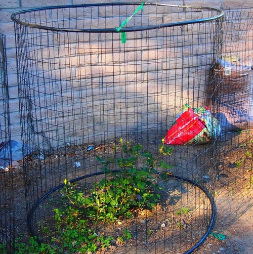 Steve - how do you connect the cage to the ground? I ask because once my MIL had a large cage over a rose in her back yard, and woke up in the middle of the night to a horribly loud crashing noise that went on & on. Turns out a deer got the cage caught on its antlers, and ran all over the patio trying to get it off. It eventually succeeded, but the cage was trashed (rose was OK).