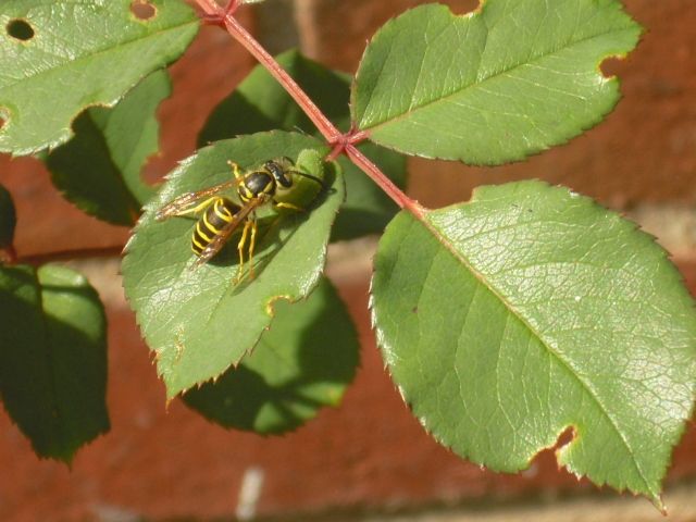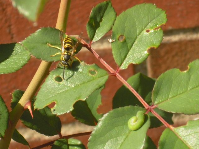 It's not a bad idea to be afraid of yellow jackets. Other kinds of wasps will do this service without attacking the gardener--although yellow jackets don't usually do that until October, unless you get too close to the nest. Anyway, if you have paper wasp nests in the eaves, let them be, because they will help with the rose slugs and other worms in the garden, and they won't sting unless you ask for it.