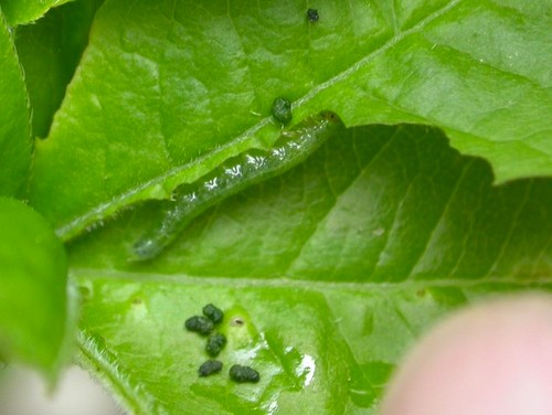 Wipe the little green worms off the lower surfaces of infested leaves with your thumb, or spray Safer Soap with 100% coverage of those same surfaces. Actually I don't have to do anything, because wasps pick off most of the worms. The spots are areas where the lower surface of the leaf has been nibbled off, leaving the translucent upper cuticle, which looks whitish.