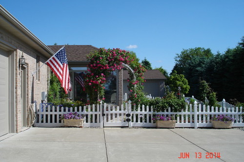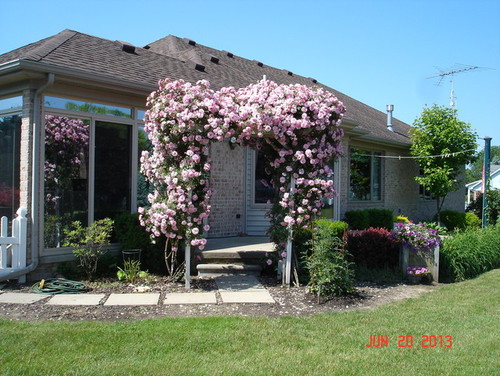Thank you Cynthia, yes it is my yard. They require regular grooming and cutting back to look neat, esp John Cabot as he is seen from the street. We use both walkways thru the trellis's so they must be open and clear. They thrive on pruning back, get "haircuts" about 3 times a summer.