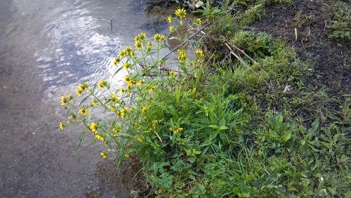 I think the foliage looks wrong for a garden variety sunflower, aka Helianthus annuus). Goin by the small lanceolate foliage I would guess it is some perennial Helianthus (no clue, are there native annual sunflowers over there?...). That it grows at the water's edge is somewhat unusual. Is it a creek or rather pond? Sometimes Jerusalem Artichokes get washed downstream, or rather bits of their rhizomes.