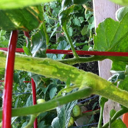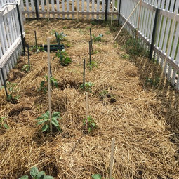 They are not staked and supported by twine and, I suppose, each other. Now I'll just cross my fingers and hope for a delicious crop. I'll also have learned for next year.