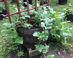 I've been growing icebox size watermelon (sugar baby and its hybrid cousin tiger baby) in a 25-gallon half whiskey barrel for the past five years, and it works well in my situation. I plant my seeds indoors and transplant them very gently when they have just formed their first true leaves and daytime temperatures are reliably above 70. I've grown four or five plants in the barrel and gotten an average of two watermelons for each plant. I did try trellissing them, but as soon as I see the melons begin to form, I gently rearrange the vines so the fruit is resting on the ground or some sturdy platform. The vines still range over the trellis, which is very pretty, but eventually they climb out of the pot and extend a few feet out from it on the ground. My melons are usually around five pounds, which may be a little smaller than ones grown in the ground, but they are so sweet and clean. The planting mix I've been using is the 5-1-1 they talk about in the Container forum. It's five parts pine bark fines to one part each perlite and peat moss. My situation may not be ideal, but I can't grow melons in the ground, and this works well for my small family. Here's a photo from last July.