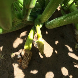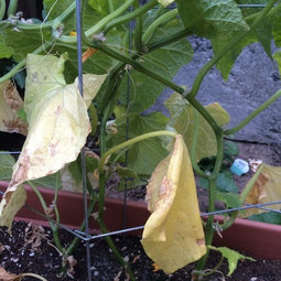 My leaves (the older) look like they have powdery mildew and at one point I did have white fly which I sprayed naturally but it still kept the bees away. Now I have a plant that is producing what looks like great fruit (and a conjoined) but most have just shrivelled, turned brown and well that's it