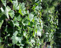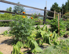 ing." I have landscaping around 3 sides of my house where I have a variety of flowering shrubs and flowers. Among the landscape plants on the south side, I have planted bush cherries, a blackberry bush, a pomegranite bush and a strawberry patch. In the spring I intend to add 3 cranberry bushes and some tomatoes and eggplants. In front of the house I have interspersed herbs among the flowering shrubs and flowers. On the northside of the house I plant tomatoes, eggplant and peppers among the flowering shrubs and flowers. In front I also have a Japanese persimmon tree and a cherry tree. In the backyard I have a plum, 2 asian pears, 2 paw paws, 2 jujubes, an apricot and 3 fig trees. A also have a blueberry, 2 raspberry and a blackberry bush. I have a trellis on which I run 3 hardy kiwi vines and a pergola on which I run 3 fuzzy kiwi vines. For additional garden plants I have a 10'X20' garden plot where I plant beans, greens, parsley, garlic, leeks and tomatoes. I also have a raised garden where I have 2 gojiberry bushes and I am planting artichokes, radishes and carrots. Finally, I have 2 honeyberry bushes. Here are some pictures.