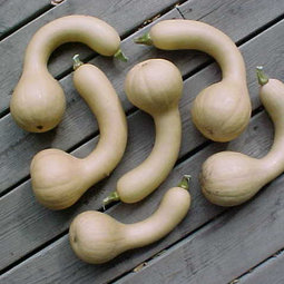 These look like small versions of "neck" pumpkins, which have an even smaller bulb at the bottom. They are butternuts (C. moschata) which gives them natural resistance to squash vine borers. Most neck pumpkins like Dickinson Field Neck are very large, though. A straight neck is a desirable characteristic, too, for easier processing.