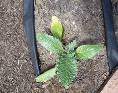 Now, its about time to plant. Clear plastic will heat up your ground before you plant. Black plastic will not. Clear plastic solarization is thought by some to disturb/ destroy the beneficial biota of you topsoil. So heat with caution and read more to find your way. That aside: in spite of the wind, lay the black plastic on the ground...no need to weed or cultivate. Drive a short stake into the center of each hole. Pick up the plastic and prepare the area at each stake as you wish. I try to remove a half bushel or more of soil to my compost and fill each hole with a compost soil mix. Replace the plastic. Batten down the edges with soil, stones boards, etc. Plant and water individually, as needed for a week or two.