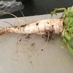 Fast growing and quick satisfaction, radishes are under a month, and you can eat the green tops as well. We also cook the radishes themselves, take kind of like cauliflower.