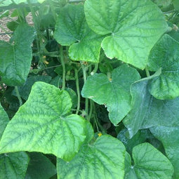I hope this will do. I have 9 cucumber plants in a home-made self watering container. They were doing fine on Friday but now 2 plants have this discoloration. Most of the affected leaves are close to the growing tip and some of the unfuled leaves on two plants seem to be discolored in the same way.