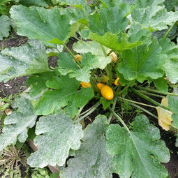 Most summer squash get powdery mildew when the plants get old and tired. There are a few resistant varieties, but most people pull out plants when they go gray. Agree that the pepper is fine, it's just an unusual variety in the Southwestern tradition. That's how some of them hold their fruit, above the foliage.