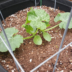 Because my feeling is that the containers (especially with the loose 5-1-1 mix) won't support the spreading branches after a while. I figure the upper branches will rest on the cage as it grows upwards. It's just an experiment at this point. Last year I grew yellow squash in regular growing soil and it didn't do so well so every year I try something new.