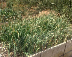 Shortly after this photo was taken, I stopped watering all of it, hard and soft neck alike. I waited about a week, didn't cut any flower stalks off, and harvested. I cut the flower stalks off after harvest and hung 'em all up by their stalks - don't cut any of those off as each stalk is a layer of that white papery skin that protects the cloves. Since it is so dry here, I am letting then "cure" for 2-3 weeks on the back porch where it is completely shaded.