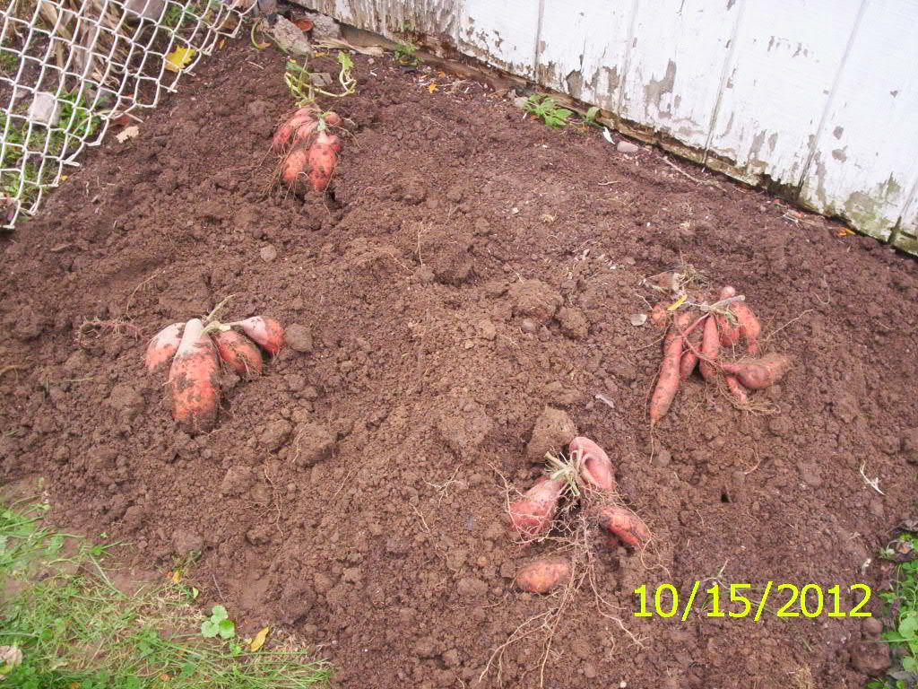 Edweather, those are beautiful sweet potatoes you harvested. I used the toothpicks method to suspend my sweet potatoes over water with about a third of the potato or less in the water. I've gotten lots of beautiful slips. When the slips are about 6" long I put them in a canning jar with a couple of inches of water in the bottom. They developed roots so fast I couldn't believe it. I hope I get as nice a harvest from each of mine as you did.