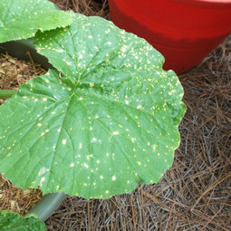 Couple of different possibilities. Start with the easiest - look at the underside of the leaves. Do the spots go all the way through? Look for aphids, squash bugs, spider mites.