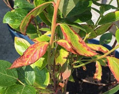 Blueberries same as above - in a container they require regular feedings every 10-14 days of a well balanced fertilizer. Nutrients leach out of containers everytime you water so you have to replace them regularly. Blueberries also require very acidic soil to grow so normal potting mix doesn't do well for them and they need an acidic fertilizer as well.