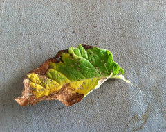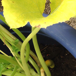 I am 100% with everything digdirt said. I suspect over fertilizing, over watering. The planting medium also looks suspect, though of course its hard to tell. But I hope you have something besides just wood mulch in that pot. I also fully concur with his suggestion about repotting and, even more importantly, burying that long, thin stem most of the way up. Its also too young for fruit....is it outside? Is it an ornamental or what variety. I think I pretty much just repeated degdirt's post but it was worth rementioning. good luck.