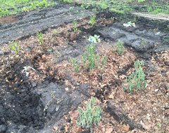 For my lasagne beds, those just got built right on the grass. I used a double layer of brown paper shopping bags, again overlapping by a couple inches and extending beyond the bed by a few inches. I've done the double layers in two ways- one bed was created by cutting the bags open and laying them out, the other was created by just leaving the bags whole in their folded state and laying them out. Leaving them whole uses up a more bags, but the layering is thicker so I think it works more effectively as a weed barrier.