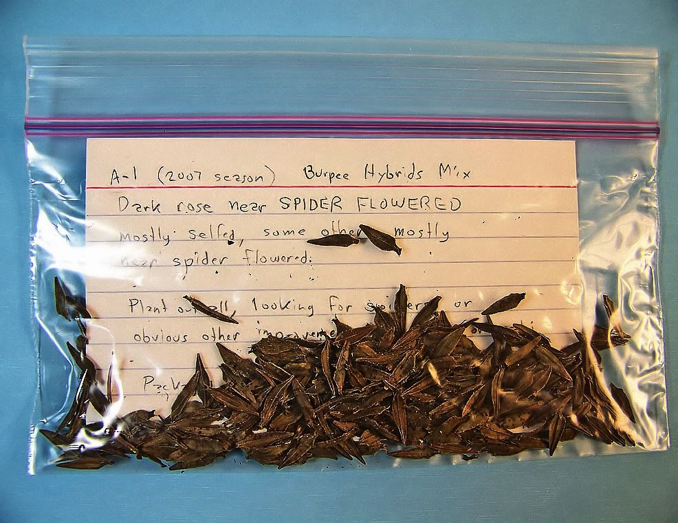 Notice that the petals still have some color to them. Unless you plan to plant the seeds immediately, you will need to dry them before you store them. You can spread them out on a newspaper, or something like that, and let them air dry for a few days. Obviously you would not want to dry them in the oven, because that would kill the living embryos. After they are fully dry, the petals will be "crispy" and easily removed from the seeds. I store my seeds in Snack-sized Ziploc bags with a 3x5 card identifying the seed in some way.