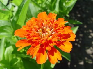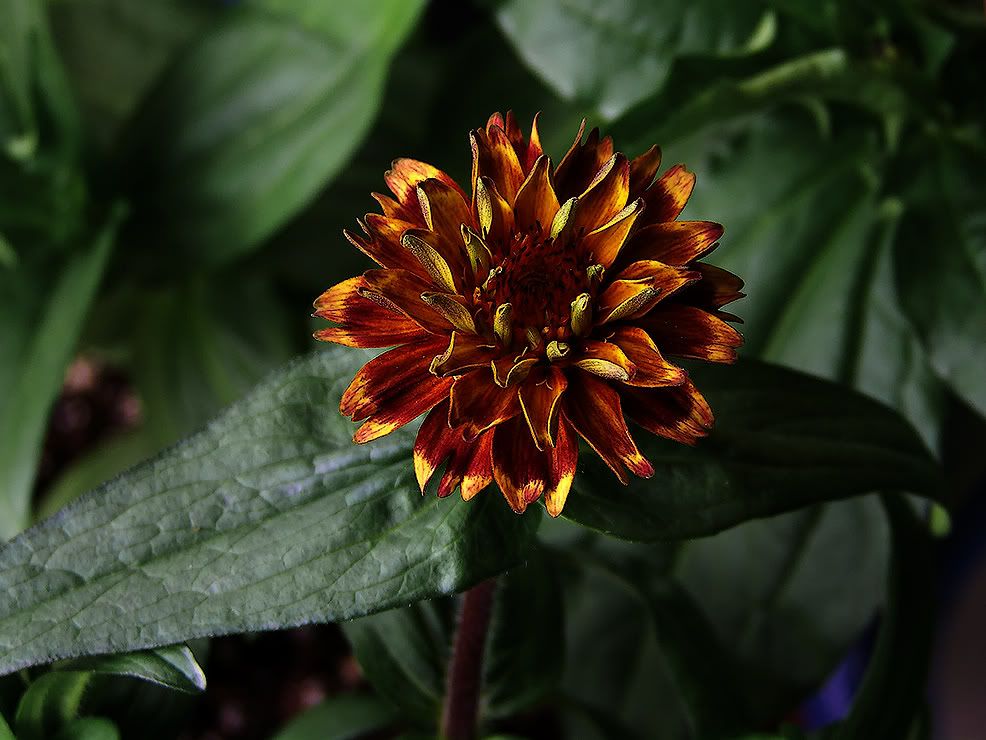 | JG, I questioned several sources, and from Andrew Tokely, the Horticultural Manager of Thompson and Morgan, I found that "The Scabious Flowered Zinnia was achieved by Selective breeding over a number of Years. Excellent forms of this have been bred over the years mainly in Holland, Poland, and the Chec [Czech] Republic." Many thanks for digging up that information. Your scholarship is much appreciated. I still wonder if one or more mutations didn't play a part in the origin of the scabiosa flowered zinnias, but Boyle and Stimart didn't seem to go into that, except to note that their florets were different. One of my Aztec Sunsets exhibits an unusually compact plant habit. This picture is approximately 130% life size on my screen.