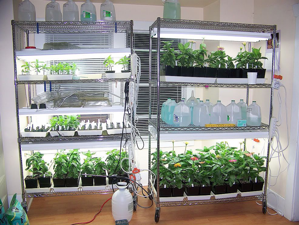 I have two homemade plant stands, using chrome wire shelving units with 24" x 48" shelves and inexpensive commercial shoplights from Home Depot. My six shelves are not wholly utilized at the moment, but I will be planting more seeds and removing rejected plants to make room for them. Within a week or two I should have all the shelves fully utilized. These two growing units are in a bay window area of the same room with my computer setup. There isn't room for another growing unit in this room. However, if the need arises, and it probably will before Spring, I can assemble a third growing unit on the landing between the ground floor and our basement. ZM |