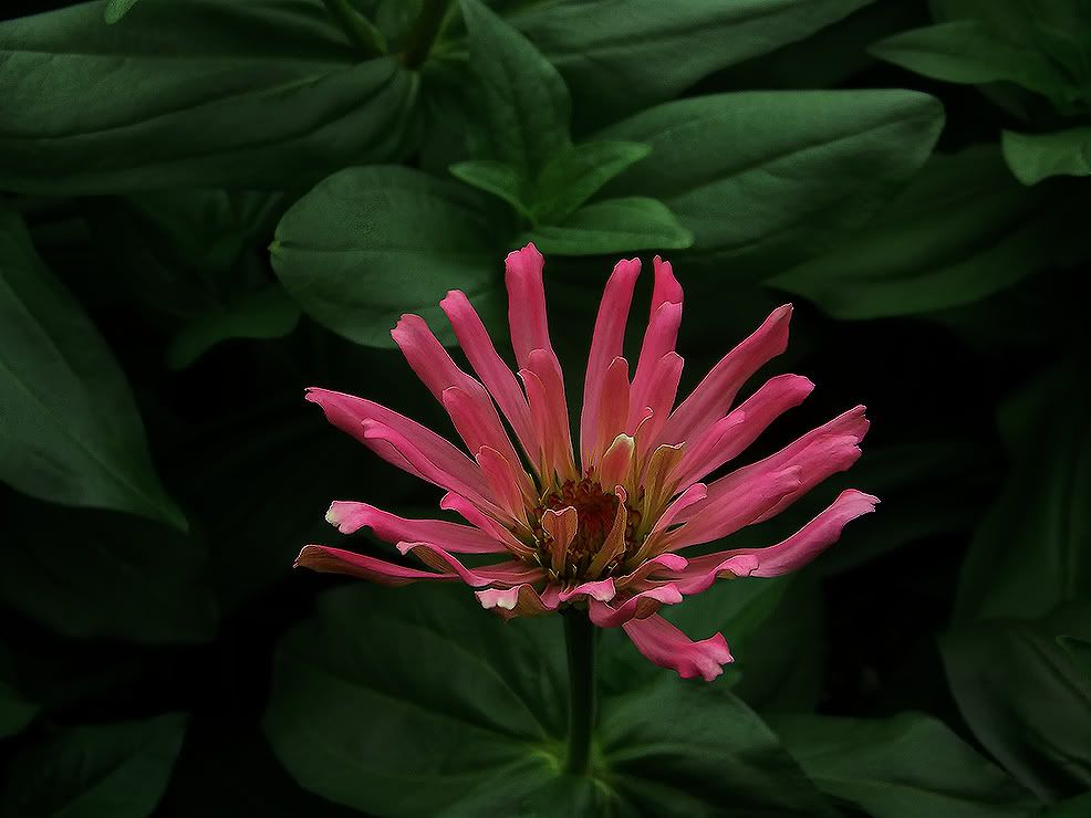 | JG, "I've been also reading about growth regulators like Bonzi and Sumagic. I guess it's a matter of studying general directions and experimenting a little to see what works best with zinnias." Bonzi and Sumagic can be applied either as a drench or as a spray. Bonzi is listed as especially effective on zinnias. I don't have current info on Sumagic. If I find a reasonably affordable (not a lot over $100) source of Bonzi, I may get some, in order to compare it with A-Rest and Topflor on my indoor zinnias. "I think I would be on the conservative side there as far as usage goes, if I decide to try this (still thinking that over!). I notice the manufacturer of TopFlor is about twenty-five miles from my home." That's interesting. Perhaps you could get a small sample of Topflor there. I guess any PGR can be phytotoxic in excess or, at a very minimum, cause excessivly stunted growth. I am still getting experience with the practical matters of applying the stuff. At about the four-true-leaf stage, my zinnias tend to put on a quick growth spurt, at which time they can outrun your attempts to control their height. The zinnia internode lengths can quickly increase at that stage, and there is no way you can "undo" that. I have a few zinnia plants that may have been overdosed with Topflor, in that they seem to be almost dwarfs, and they don't have any short zinnias in their ancestry. But they are starting to bloom, so I still have access to their breeding potential. The lowest price that I know of at this moment for a PGR is A-Rest at $87.50 from J.R. Johnson. Shipping will probably bring that cost up into the $100 area. "Your pink flower is nice. What are the parents? Is that a cluster of chaffy scales in the central part?" Those are chaffy scales. It hadn't put out any pollen at the time of the picture, but I see it has put out some pollen florets this morning. Its "mother" was code-named B28, which was described in my journal as, "Big rose colored spiderish flowers, possibly the best spider of 2008. Caged, water spiked." As a choice breeder, it was selfed and crossed with "likely" males. So it is probably best described as a recombinant. I may remove the flower to encourage branching for reproduction of cuttings. But in the meantime, I will use the pollen on some other breeder females. This is a picture of one of my current single blooms.