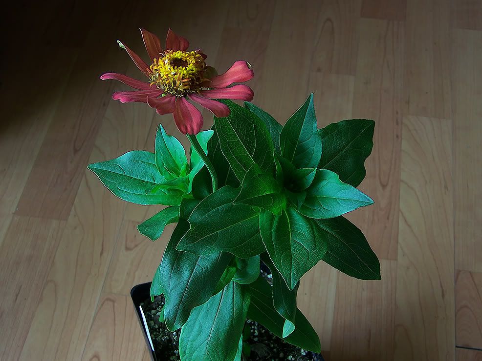 | JG, Your pictures do give a good idea of the charming looks that the species zinnias can have, and they inspire me to attempt interspecies crosses. "But the plant growth regulators (to reduce height)! Wow! It sure would be nice to be able to purchase something in "trial size." Are any of them available in quantities for less than $100?" Apparently not. I was never able to find online or local retail sources of small quantities of any of the plant growth regulators I use. You might be able to find a local greenhouse grower who uses PGRs who might be willing to sell you a small quantity, or even just give you a small sample. On the other hand, they might be concerned about their liability and legal issues. But since controlling plant height was vital to my indoor zinnia projects, I "bit the bullet" and paid those relatively high prices for plant growth regulators. So far this Winter I have used only Topflor, but I intend to use some A-Rest as well. I had some success with both PGRs on zinnias last Winter. My first purchase was some B-Nine, but I was unaware at the time of the purchase that it had to be applied as a spray for leaf absorption and that it doesn't enter the plant through root absorption. Spraying the leaves is inconvenient for indoor gardening, and if it is very cold outside you can't move them outside to spray them. I did paint some B-Nine onto the leaves of a few zinnias using a big watercolor mop brush, and it does work well absorbed through the leaves to control internode growth. But brushing the solution on is too tedious to be practical, so I bought some A-Rest and Topflor because it easy to apply them in a soil-drench in an indoor setting. Several of my indoor zinnias are now showing promising blooms that qualify them as breeders. I like the informal loose open form of this recombinant specimen.
