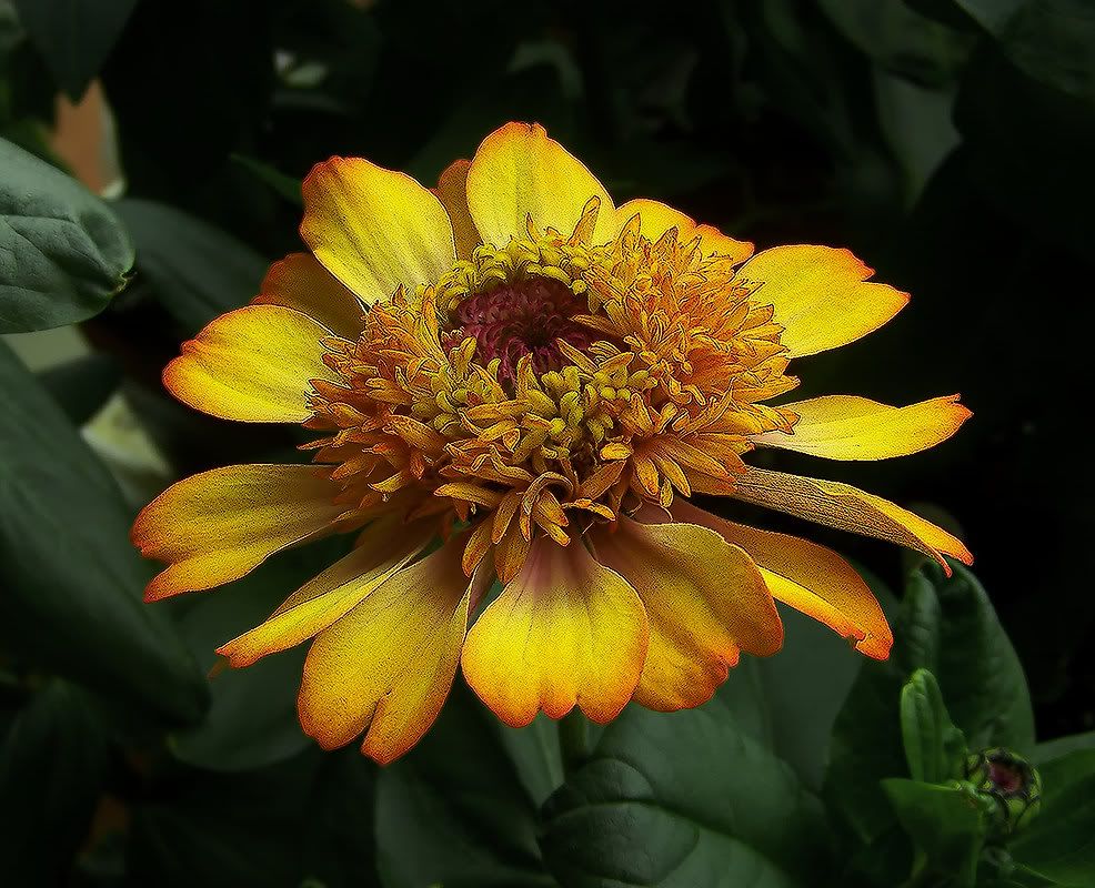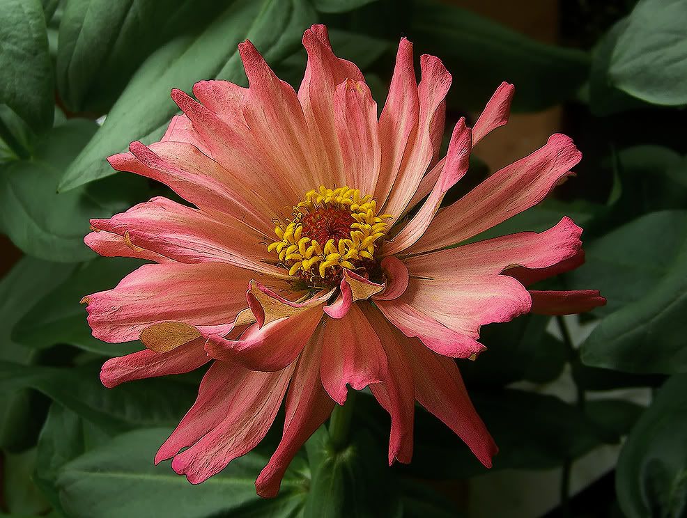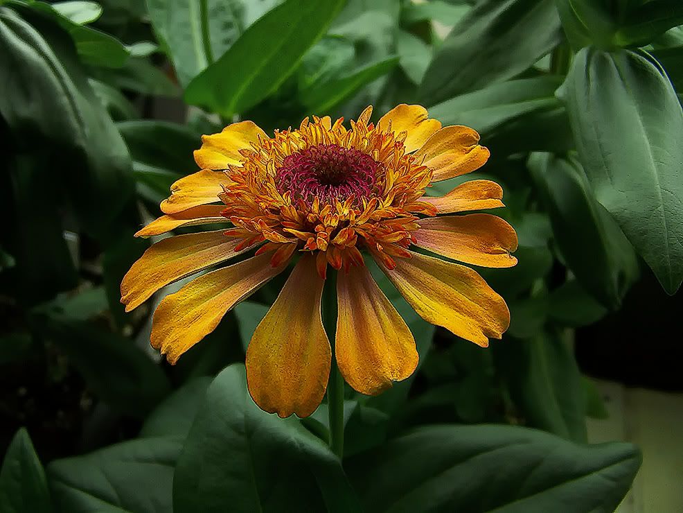 | HC, "It seems that last autumn we all noted that flowers were aging differently in the autumn than they were in the summer months." That's true. I kind of thought it might be the cooler weather that was causing that. And that may still may be the case, but I am also seeing similar effects indoors with temperatures that aren't really cool. I took this picture yesterday of a large zinnia bloom that I really like, because it has yellow and orange colors on the petals, with the lighter yellow coloring toward the base of the petals.