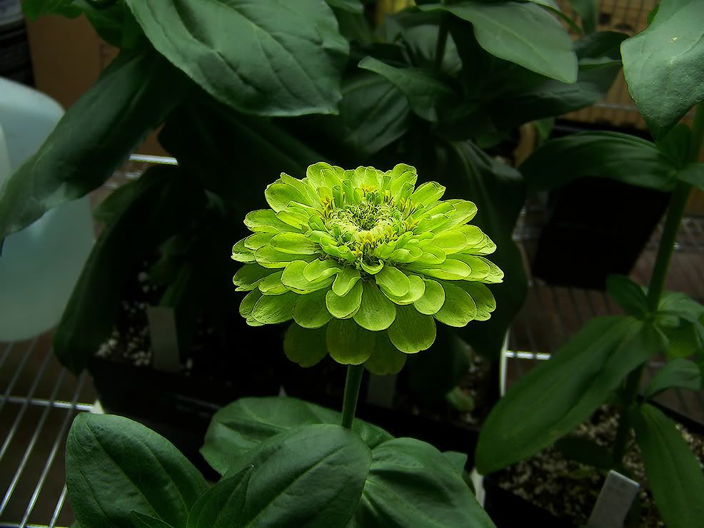 | ZM, The Tequila Lime is a great green. I love it! Now I'm extra glad I have a pack waiting to be planted. Why don't you try the strain of white zinnia that Burpee is offering called "White Wedding Zinnia" ? I'm thinking there might be some interesting crosses with that one. In some of the listed reviews, several readers said there was a tinge of green in those flowers toward the center. That could be a result of the amount of sun the flowers get-possibly the green happens when they are planted in part shade? Just a thought..as I noticed some of my Envies last year tended to get paler green the older the flowers got when they were in full sun. Then, there were also a few Envies that had patches of white throughout the plant, even in the stems, no matter what the age, probably because of a mutation. Yes, I got very rapid germination (overnight!) with the Park Seeds I tried last year in the magenta boxes. They were actually sitting on elevated filter paper saturated with hydroponic solution in the boxes, with the boxes sitting on a heating pad. I think Park does a first- rate job of packaging seeds in those foil packets and most likely, their storage conditions are good, too. I've never been disappointed in Park seeds of any kind. Love that green--and it's only 16 more days until the official Green Holiday! JG |