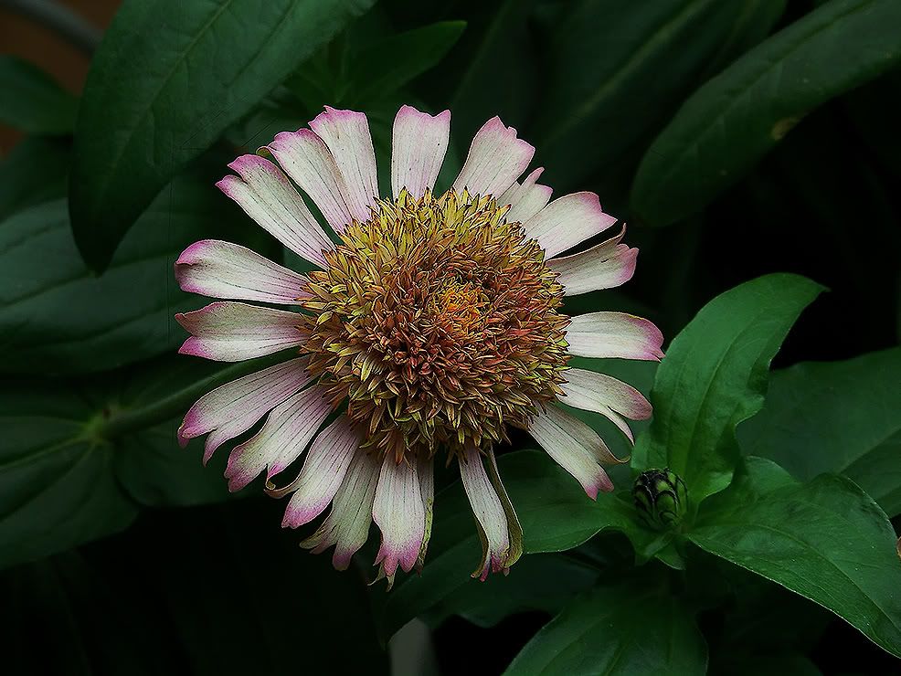 | Dave, "I have a question though, on the flowers where you use the stigmas, where are the pollens? Do you cut them off? Do they come later than the stigmas? Do you/I have to worry about self pollination? Self pollination of a choice breeder is not necessarily a bad thing. But some zinnias don't have any pollen at all, or very little, and they are "natural" females. If a breeder does put out a few pollen florets, I usually use them to pollinate other breeders, or I may deliberately use them to self that breeder. If a zinnia produces a really large excess of pollen florets, I don't like that and it is disqualified from breeder status based on that. I may remove that plant to make room for a replacement, or just to give the nearby zinnias more room. Very, very seldom do I waste any time emasculating a zinnia. Outdoors I use nets to keep bees from stealing choice pollen and also to keep them from randomly pollinating my breeders. I also use the nets to protect my setting seeds from seed-eating birds. The rules are a little different for the scabiosa flowered zinnias. There is frequently only one row or two of "guard" petals, and their stigmas are naturally female. The central florets can be interestingly ambiguous. Some specimens present stigmas in the florets and I frequently pollinate them as if they were petal stigmas. The later florets usually self themselves to produce floret seeds and I sometimes get pollen from them to pollinate other zinnias. This picture shows a recent bloom from an echinacea flowered hybrid that has continued to bloom while also setting seeds in older flowers on other branches.