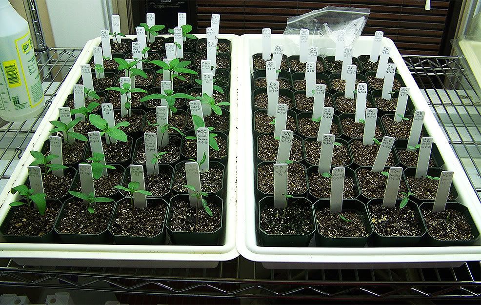 I plant a single seed in each 2½-inch square pot. I will be repotting several of those into larger pots tomorrow. I have some zinnia hybrids in there from crosses that I pollinated in January of this year, along with some commercial peppers, eggplants, and tomatoes. I have a few of the new Burpee seedless tomatoes that I am trying this year. ZM |