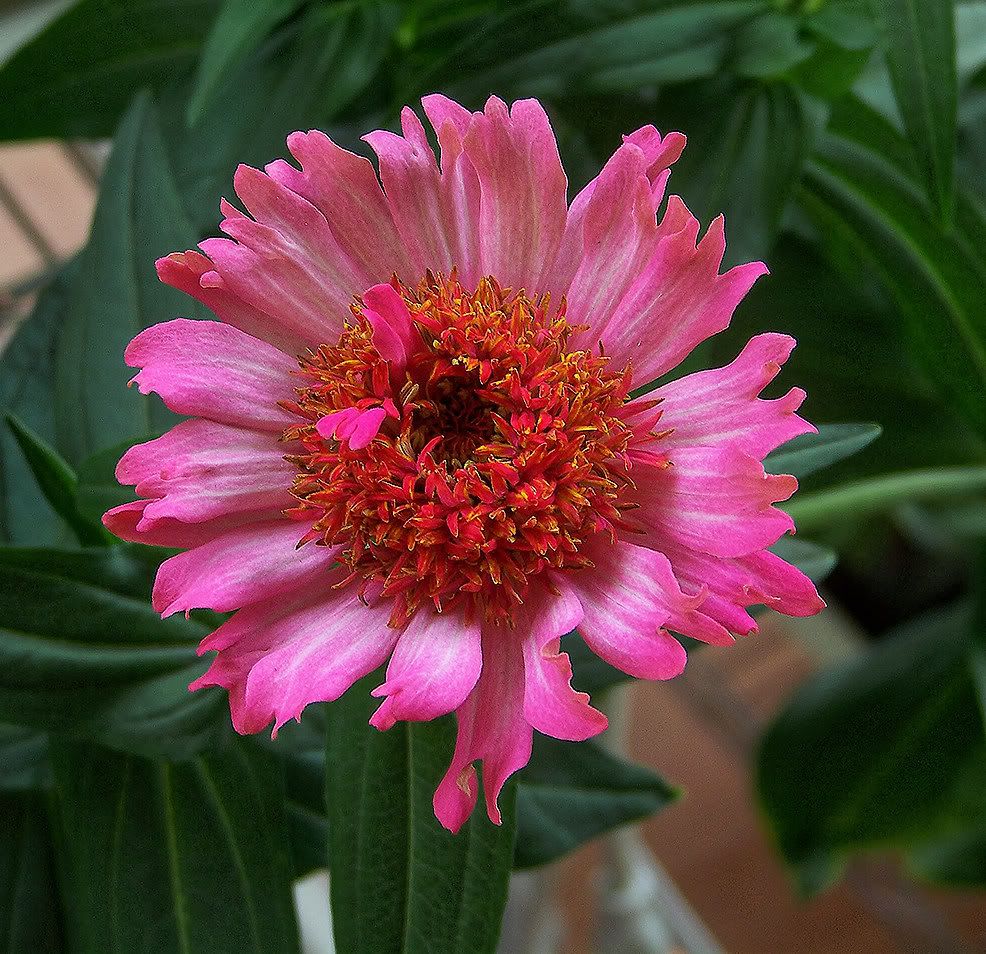 | This is another "Echinacea flowered" zinnia with a scabiosa flowered parent.