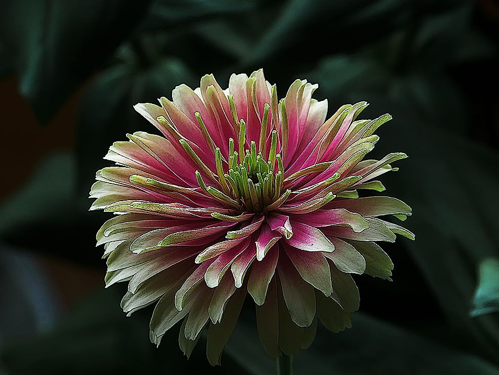 | ZM, C6 definitely has colors I've not seen in scabious-related zinnias. I think you said earlier it had some whirligig genes in it. It's pretty! The plant itself looks extremely healthy. It seems you definitely have indoor zinnia culture perfected (or at least, close to---!) (Have you gotten a new camera?) JG |