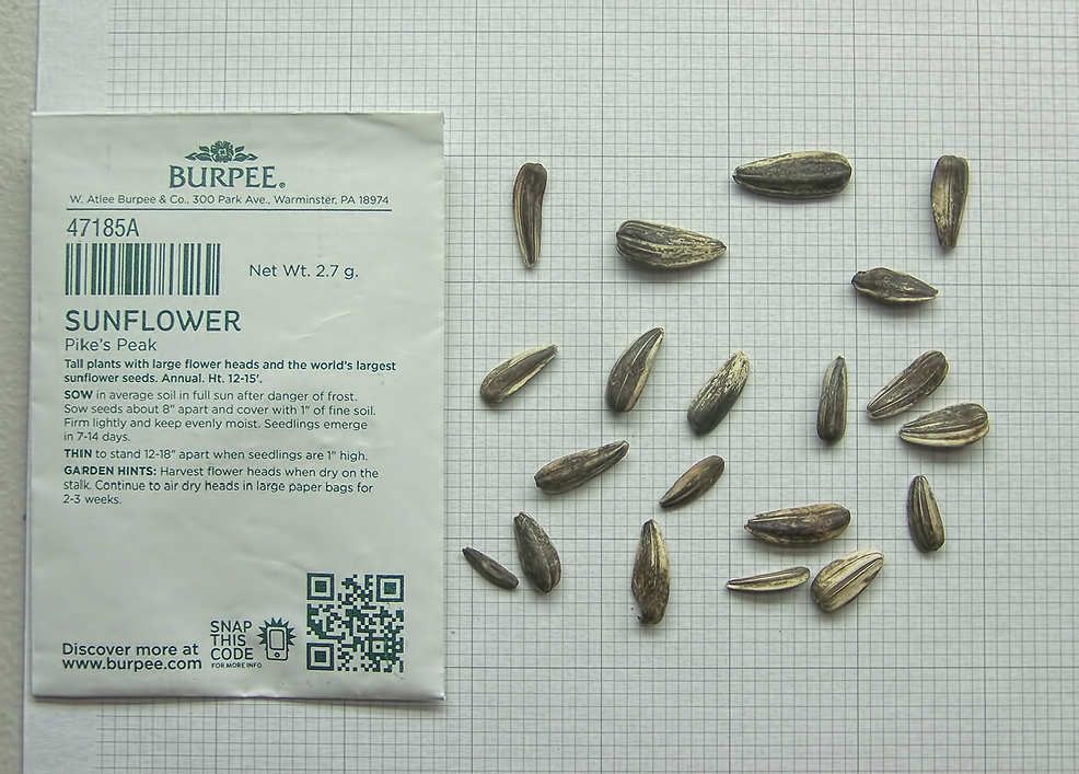 | Scott, There is some really authoritative advice on the Tips and Advice page of the SunflowerSelections.com website. Particularly relevant is their paragraph 4, which I will quote here: "Many growers like to start their plants early and transplant them to their gardens. It is very important to realize that sunflower plants make a central tap root that likes to grow straight down into the soil. Maximum growth is achieved when this process occurs without disturbance. Plant scientists know that growing conditions such as stress and day length as early as from three weeks after emergence can trigger the plants to flower earlier. So, if you like to germinate your plants in trays under lights be aware that transplanted plants will ALMOST ALWAYS be shorter in height when they flower than if they were planted directly into soil. And if your want to grow the REALLY GIANT plants like KONG and AMERICAN GIANT HYBRIDS, you will get the best growth by planting them directly into the soil in the garden so that their central tap roots are never disturbed." SunflowerSelections is a good source of many varieties of sunflower seeds, but they aren't the only good source. For example, Pike's Peak is offered by Burpee. I ordered a packet of Pike's Peak, and they indeed do have large seeds. This is the packet that I received, with its entire contents dumped out on a piece of graph paper, with a 1-inch grid, divided into tenths of an inch, so you can judge the seed sizes fairly accurately.