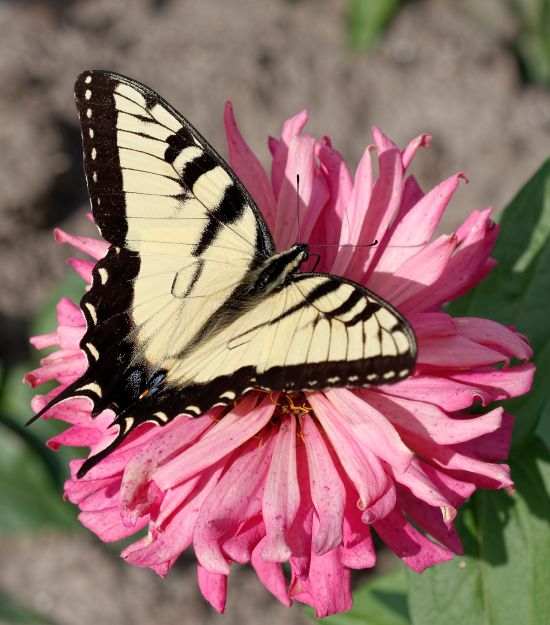 | ZM, I think your butterfly is an Eastern Tiger Swallowtail. My brother got his Masters and then PhD in entemology while working on the genetics of these beautiful creatures. I spent a few days with him driving through the rural counties on the northwestern coast of Michigan hunting for them. We could spot one across a field, so we'd stop the truck and go chasing after it. Apparently they are active for a few weeks during the mating/egg-laying period in spring, so he knew which weekends they would be out. Tough work, but some one's got to,do it. LOL. That was when I had toddlers, so we'd leave them with grandma and Dad while I had a wonderful break from motherhood. All the butterflies appreciate the zinnias you provide. Martha |