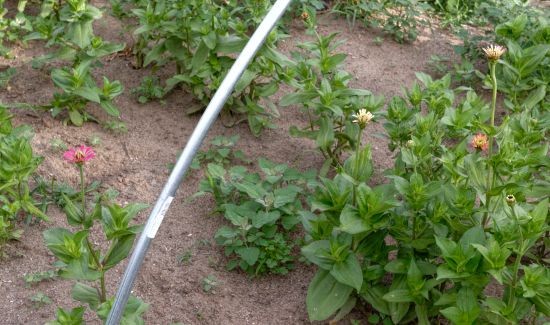 | ZM, The last two flowers you posted are very interesting. The color of the first is a really nice shade of red/coral, and it has upright central petals as does the rolled flower you showed last. I don't think I ever got such a spherical shape in any of my Extreme Rolls. That last one almost reminds me of a red clover flower--a very unusual flower! The red veins on white is also different. I think you have been very busy over winter making crosses! Neat flowers! I am slowly getting my zinnias mulched...and I still need to start several more small beds--the rain sets me back as I like to till the soil well right before sowing. Here is one of the smaller patches I completed. You can see that I sowed the seeds a little too thick in some cases! And sunflowers, tomatoes, radishes, squash, and yarrow are nearby....could we call that companion planting?