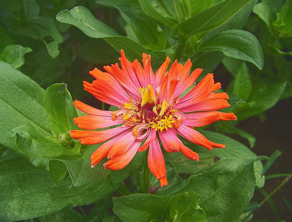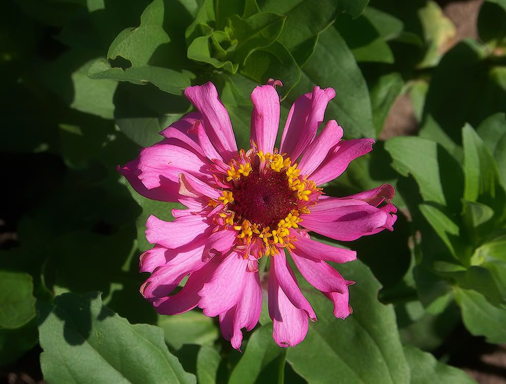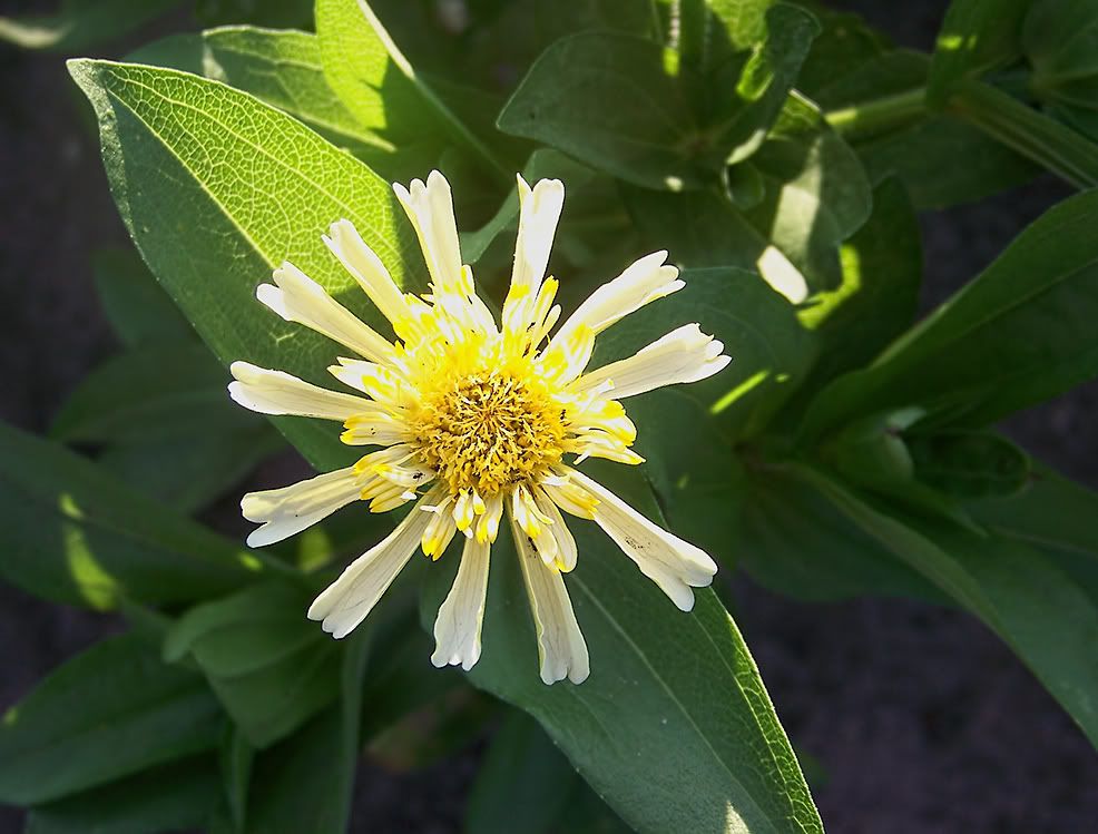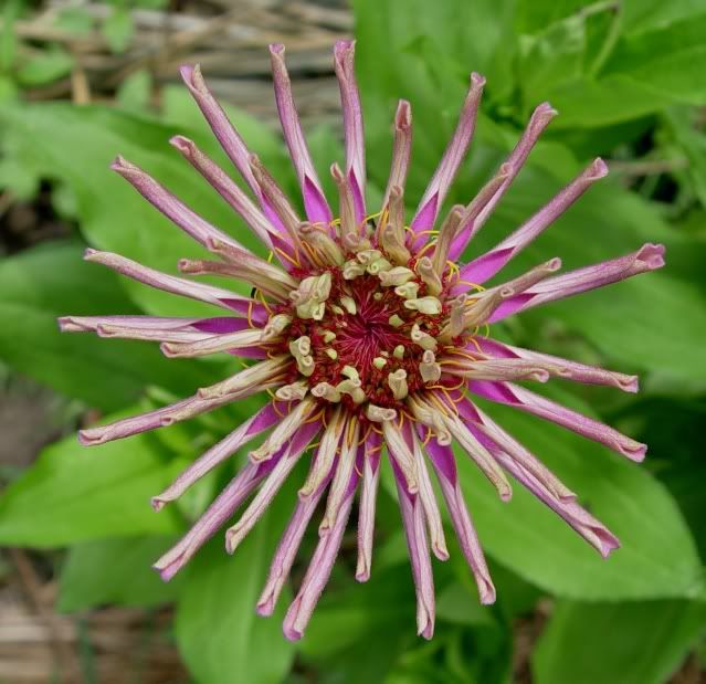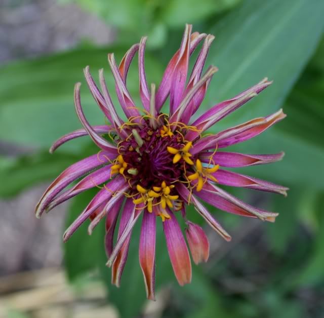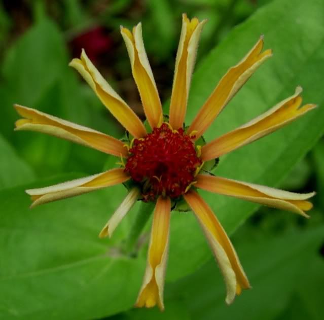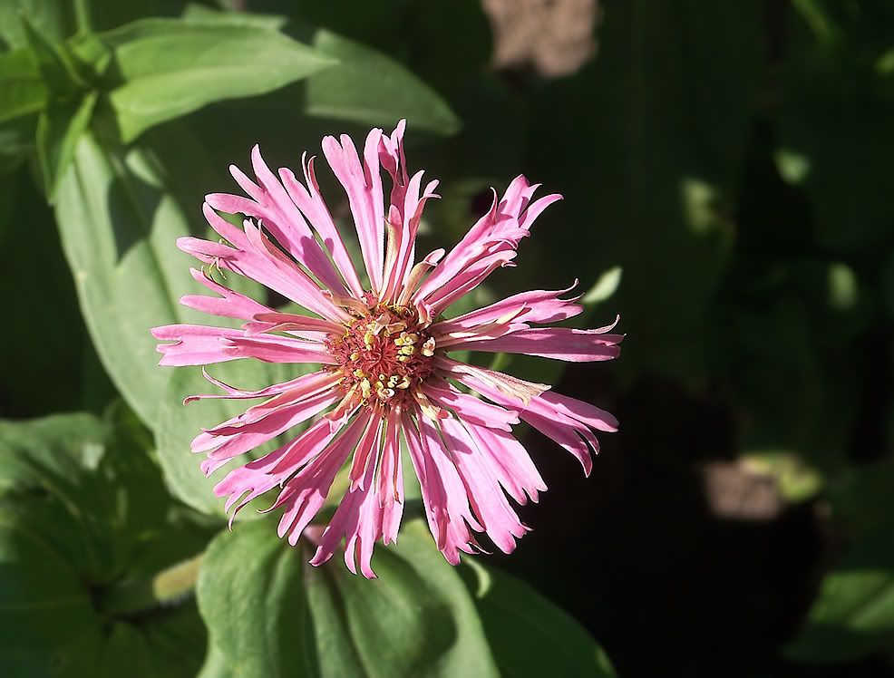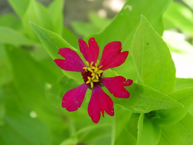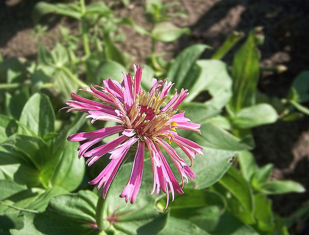 I think I will try and start a line of toothy zinnias, too, so am collecting some of those seeds to start a patch next year. I picture a large, full flower with very ragged ends, but this little one below is hardly that: