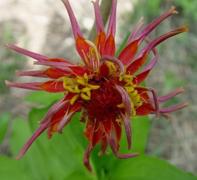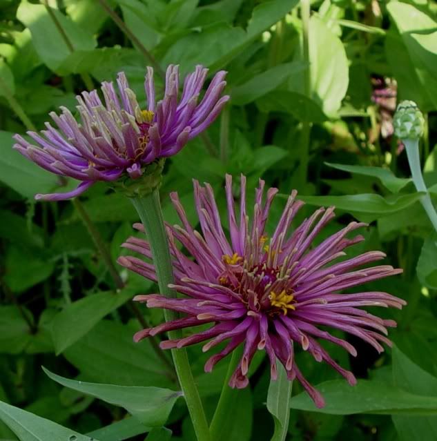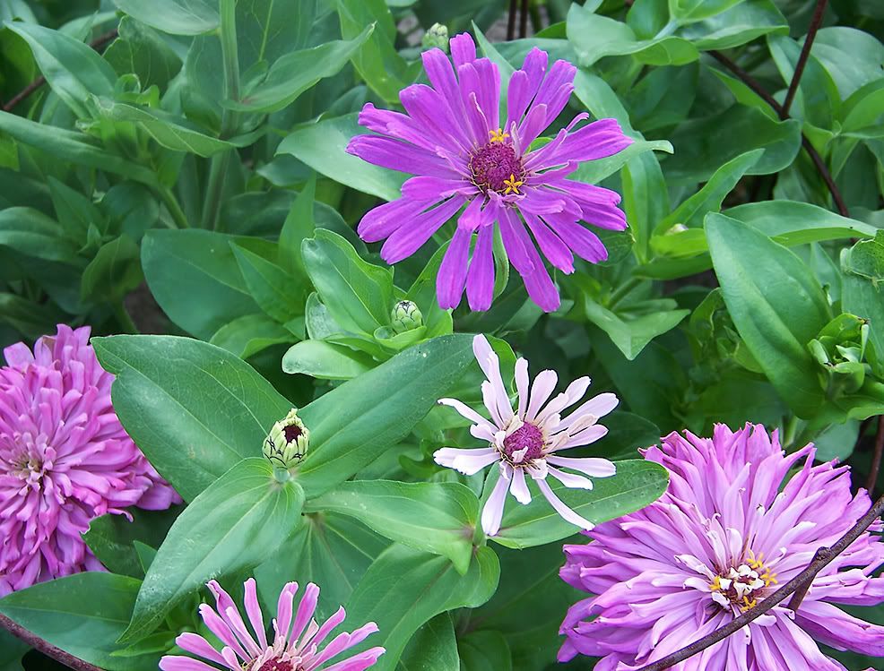 | ZM, I am going to try and plant some seeds today--they will include some of the species zinnias in addition to a batch of purple zinnias-the seeds which I've had a long time, and should use. Here are several zinnias I have today. One is a flower whose petals are spoon-like and almost tubular, and another is a red flower with a purple center. The whirligig and cactus zinnias I had last year crossed and gave some interesting offspring. I have a number of reds with purple centers, so may set the seed aside for a small patch next year. Not a good form, but a bright color combination.