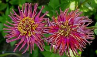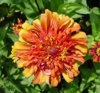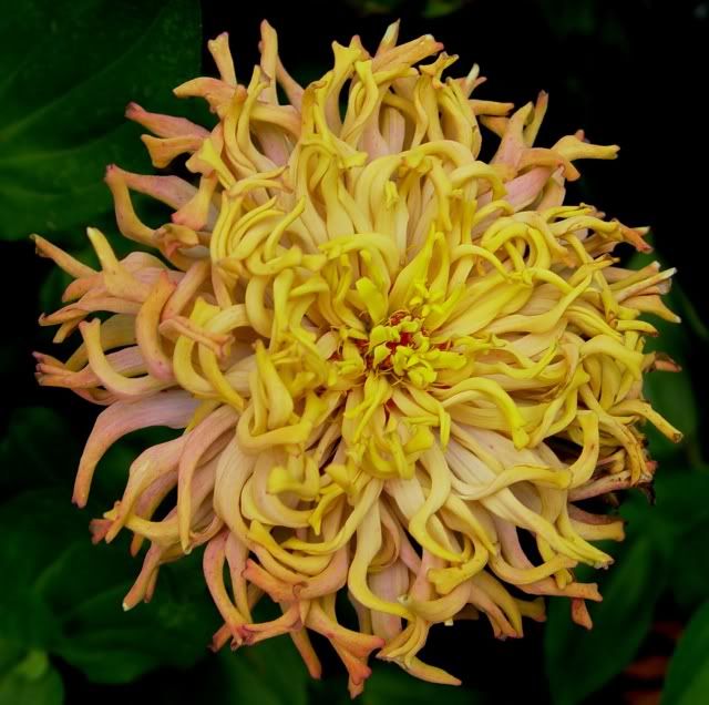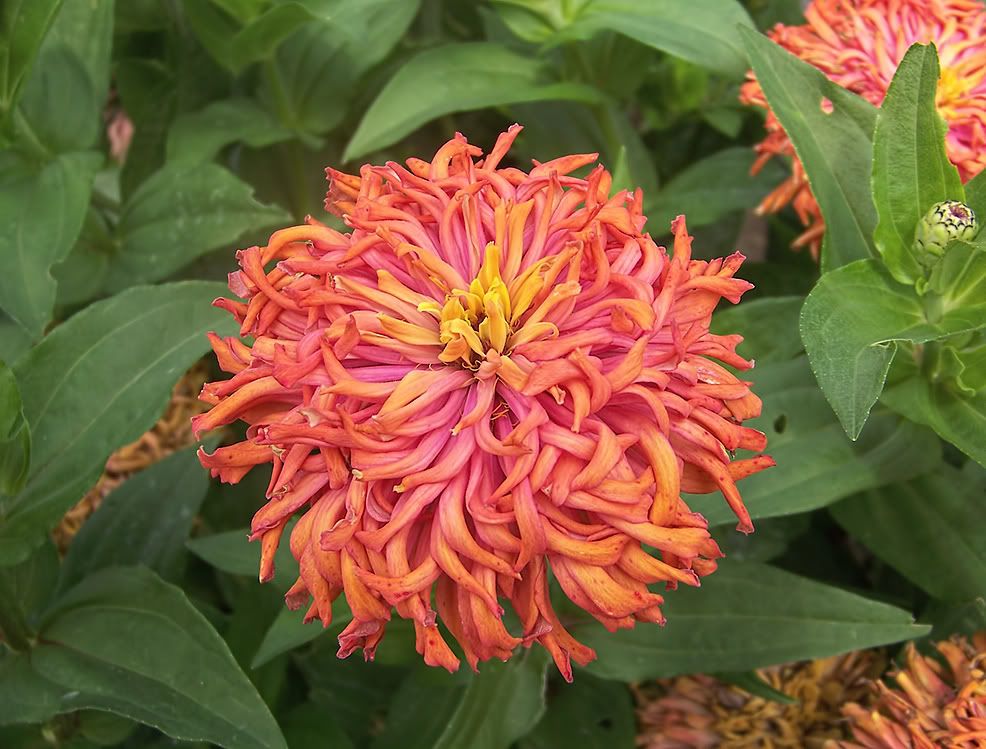 I really like that flowerform, because it is a bit different, less formal, and is less "closely packed" than many of the traditional zinnias. It also influences the classic cactus flowered form into a slightly more relaxed "bed-head" look.
