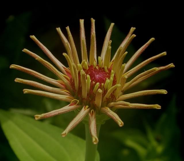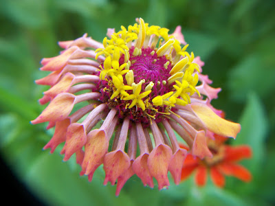 At that time, I was concerned that something was wrong with it. Now I think it was probably genetic, and a possible new flower form for zinnias. More later. |