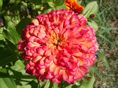 The above flower is somewhat like the two-toned zinnias ZM and Alana are showing, but mine represents one of those strange color changes that happens late in the season with some of the zinnias, and I think they well may result from decreasing temperatures and daylight, maybe, or even other accumulated stresses from insects and dryness over time.