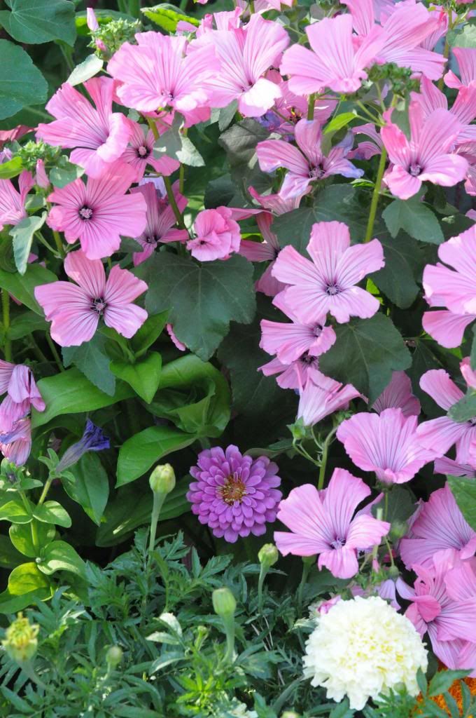 | Veggie, fortunately most of my zinnia's are "inside" the border and have free reign. I hoped the pink zinnia would pop out of the lavatera but I was wrong...I am saving seed and although many years behind I will be trying. |