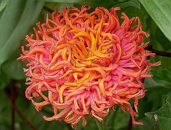 | ZM, I think you are doing well with the tubular line. You have a huge variery of colors, and there is some variation in form, too. You showed a pink flower in the last thread that was extremely full, with petals that weren't mostly upright. That was a beauty. I wonder if you could cross one of the tubulars with a scabious flower. The central florets might be compatible with the tubular form, and the guard petals would influence some petals to be more horizontal. As I said before, I am seeing plenty of strange flowers here. I think the "cat toes" flower might be the result of one too many extreme roll genes, or maybe just a different expression of them. I see variations, I think of the same form, as below: