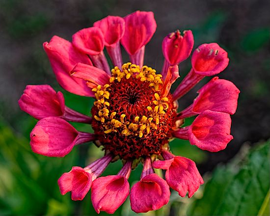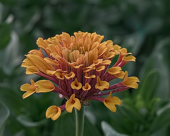 | JG, "Are you finding that these flowers with very long tubes have stigmas inside?" I have dissected quite a few long-tubed petals, and I have always found a stigma inside. I sampled four petals from the pink-and-white tubular above, and all four had stigmas. Interestingly, one of those had apparently been fertilized, because it was shriveled and darkened. The mystery of how some tubulars can get a good yield of petal seeds without any hand pollination remains. I planted two rows of "self fertilized" petal seeds from a tubular breeder, in case the fertile petal seed ability is inherited. They will probably be blooming in about a month. " Are you mostly selfing, or crossing...guess you want to keep certain lines going." I am doing some of each. Many tubulars put out a lot of pollen florets, so those provide a good supply of selfed seeds. I continue to cross tubular pollen onto likely non-tubular breeders in an effort to get significant modifications to the tubular flower form in subsequent F2 recombinations. The flower form in the third picture of your last series is significant. I sometimes think of the up-curled zinnia petals as "tulip flowered". In any case, that is a distinctly different zinnia flower form, and could be the basis for a new strain of zinnias with that flower form. I had a similar yellow one a few years ago that reminded me of a dandelion. A strain of zinnias with up-curled petals might be nice. ZM |