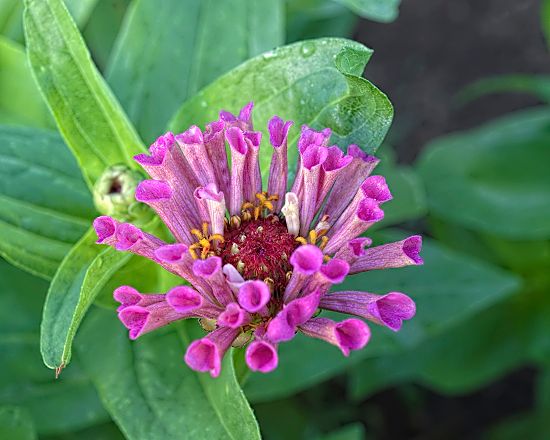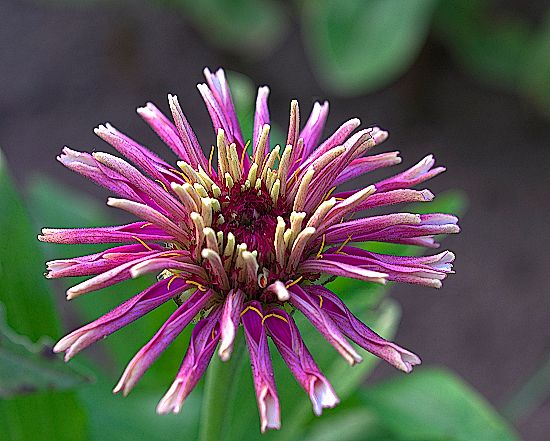 | ZM, I think you've got your challenge set up for you in introducing the toothy trait to your tubular flowers! But if you can get something close to Centaurea, that would be remarkable! Zinnias have so many color combinations and patterns to offer, you could get wonderful flowers! I like the toothiness trait, too, and you have been so successful in bringing that out in zinnias. I believe the source of that trait may originate with the whirligigs...at least, that's where I see it in my garden, in a less pronounced form than yours. I think I am going to see a lot of versions of the extreme roll trait this year, along with abbreviated petals, misshapen petals, and all the related expressions of that trait you might expect with inbreeding. I am hoping to be able to get a large flower with many needle-like petals, and in the past years, I have been able to get a few plants that have that type of flower, but at the largest, about 3 inches wide, and only in shades of purple. I have more relaxed forms of the trait blooming now like these: