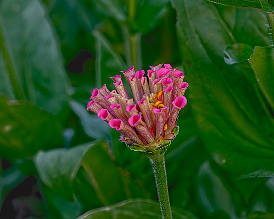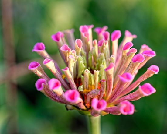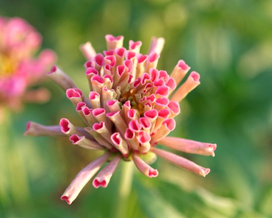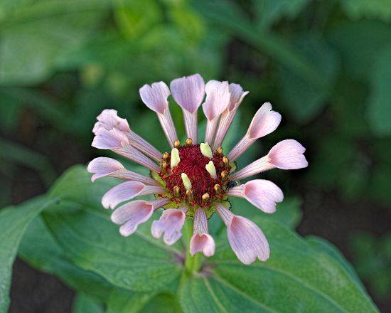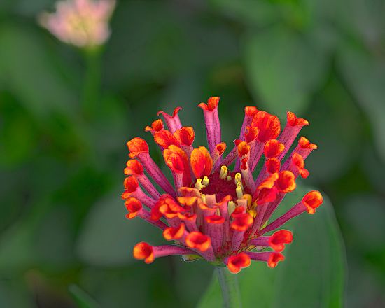 | ZM, Your zinnia garden looks good! The tunnel framework you have is going to be very helpful in the fall. It looks also that you have the weeds well under control. Even with all the hay mulch, my garden looks somewhat jungle-like. I will try to get some seeds from that scabious flower with tubes. I notice that all the tubes have stigmas. If I could get some tubular flowers even half as nice as yours, I would be very excited! I don't see anything out of the ordinary today, except for the first flower of a few Zahara (Zinnia marylandica) plants that I started from seed. An apetalous male sterile, purely female flower! For the expense of Zahara seeds, I should get my money back, hmm...I wonder if they aren't doing some hybridization with those??