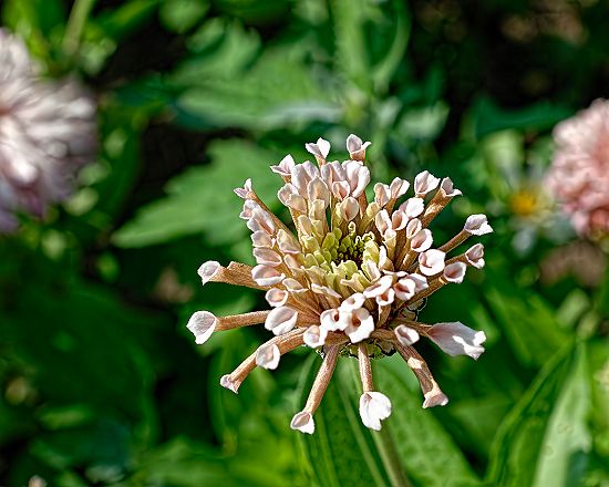 | Hello! Lots of flowers coming out here..many more to come. there are several beds I have that are still too new to have any flower buds. ZM, I agree. I think that the all-tubular flowers may definitely have a differnt type of gene expression than the flowers that show less than 100 % tubular flowers. The ones that I have don't have such well-defined tubes. Zinnias also respond to the environment in such strange ways, those less defined tubes may well be a response to some kind of mechanical barrier even when the flower is developing. What sort of form do you want with your tubular flowers? Martha, you are going to get a bunch of flowers with the plants you showed that are blooming...they look like maybe Profusions. Are they growing with black-eyed Susans in that last picture? Bob, I like the lizard you have on your flower...think of how he may protect the flower! Below are several scabious flowers again. The first has a lot of curly petals in the center rather than disc florets.